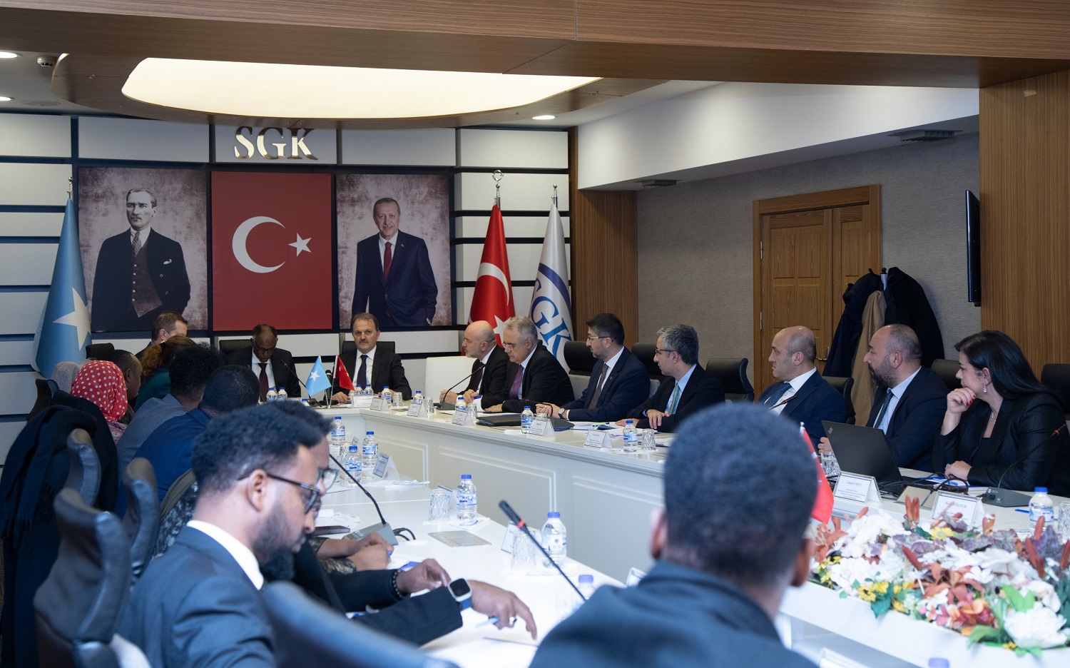 SGK Başkanlığı Binası Neşet Ertaş Toplantı Salonu’nda yapılan toplantıya, Çalışma ve Sosyal Güvenlik Bakan Yardımcısı Dr. Adnan Ertem, Somali Federal Cumhuriyeti Çalışma ve Sosyal İşler Bakanı Prof. Dr. Salim Alio Ibro, SGK Başkanı Dr. Raci Kaya, SGK Başkan Yardımcısı İsmail Ertüzün, ÇSGB Dış İlişkiler ve Avrupa Birliği Genel Müdürü Ali Aybey, ÇSGB Dış İlişkiler ve Avrupa Birliği Genel Müdürü Dr. Selim Dağlıoğlu, SGK Strateji Geliştirme Başkanı Yakup Koç, SGK Emeklilik Hizmetleri Genel Müdür Yardımcısı Necmettin Öz, SGK Genel Sağlık Sigortası Genel Müdür Yardımcısı Uzm. Dr. Kerim Abatay, SGK Sigorta Primleri Genel Müdür Yardımcısı İbrahim Özçelik, SGK Strateji Geliştirme Başkanlığı Avrupa Birliği ve Dış İlişkiler Daire Başkanı Sedat Budak ÇSGB  Dış İlişkiler ve Avrupa Birliği Genel Müdürlüğü Protokol Daire Başkanı Hakan Öz katıldı.